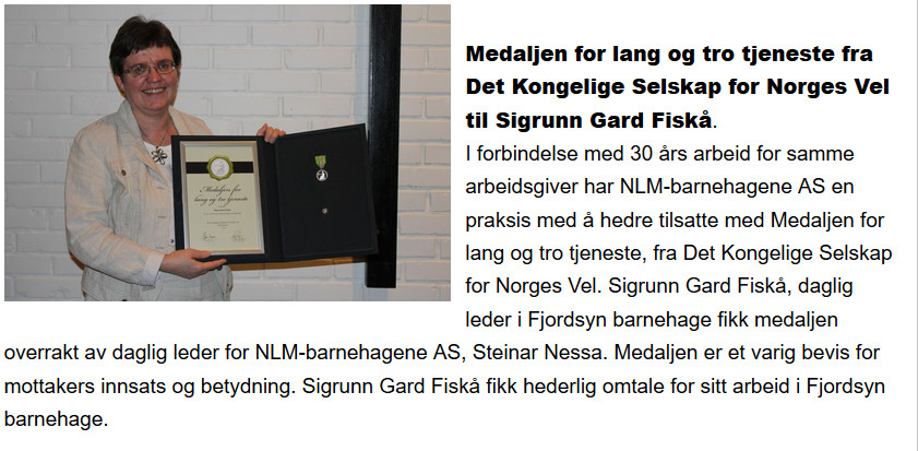 Sigrunn fikk medaljen fra Det Kongelige Selskap for Norges Vel i 2012 for sitt arbeid i Fjordsyn barnehage.