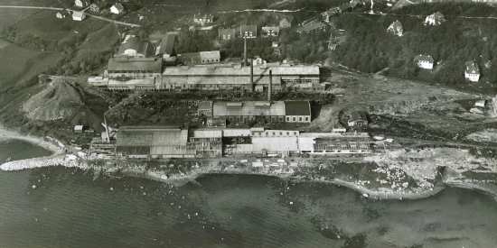 Staalverket i 1913. Hammerverket til venstre. Smelteverket og støperiet til høyre.