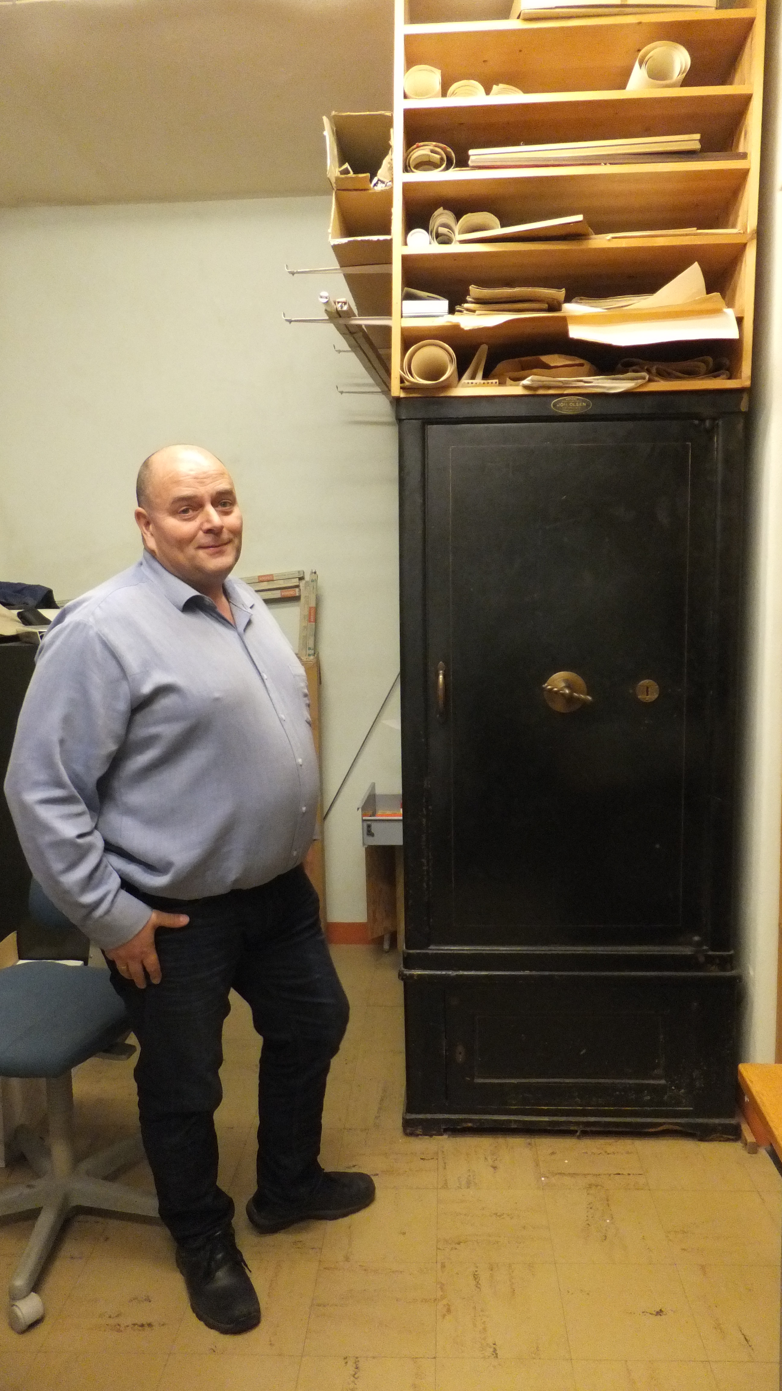 Morten viser fram det gamle pengeskapet hvor de oppbevarte penger og viktige papirer.