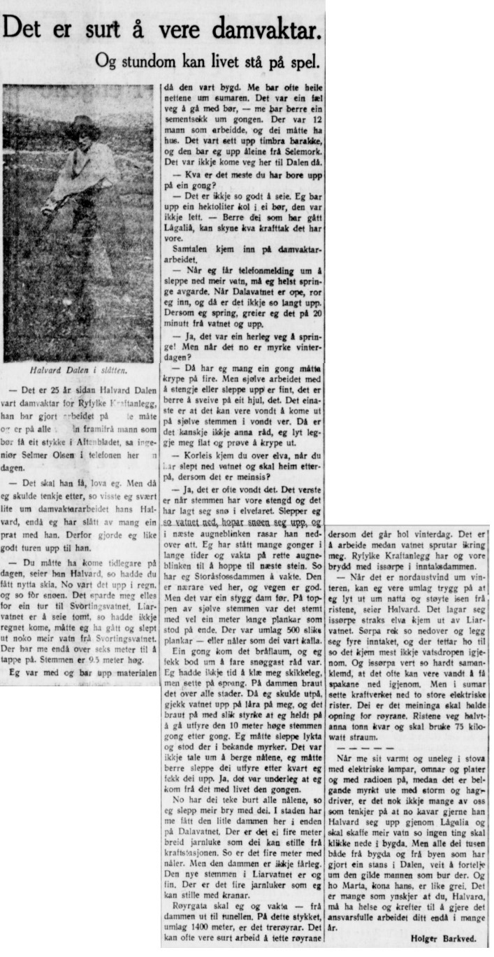 Halvard var med i den tiden de bygde demninger i Dalen. Siden ble han damvokter og måtte åpne og stenge slusene i allslags vær etter hvor mye vann kraftstasjonen trengte.