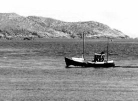 Han farbror og far var kledd i oljehyre-uverskler for sjørokket raug over atterenden på Ormen Lange. Ormen Lange var båtens navn som me hade gitt den for båten var lang og den var smal. De var ein Aslagsbåt. Bestefar hans Alfred og Martin i Vigå hadde bygt den. Han Aslag var ein god båtbyggjar. Nå hadde me kursen for Fiskevig på vestsiden av Idsø. Og nå var de god oversikt øve Høksfjoren. Bølgetoppane var store og sjørokke stod til vers over fjorden. Eg følte meg kvalmen og måtte kast opp. Her på Fiskevig skulde me nå lasta inn ein del stein for og få båten stivare i sjøen så den ikkje slo så mykje. Han farbror og far var redde der kunde slås av bånnaglar når båten var så lett. Nå narma me oss Kalvøynå og då var de Gansfjorden igjen.