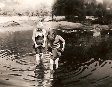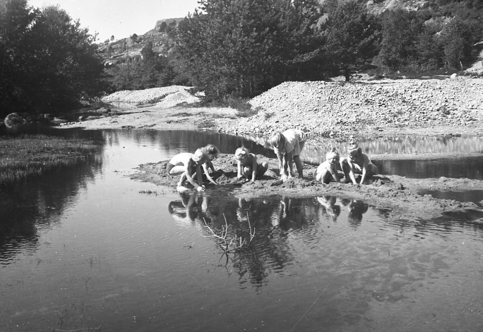 Vi vokste til og litt borti veien var en et sandtak. Der var det mange grunne finne dammer. Der lekte vi og badet dagen lang. Det var fullt av rumpetroll og vi fanget dem på glass. Vi fulgte utviklingen fra de glassklare eggene til froskene hoppet rundt omkring. I dammene plasket vi i på grunna, med magen i bunn uten å komme noen vei, mens vi drømte om å kunne svømme over den Engelske Kanal. Det var ofte snakk om slike svømmere hjemme hos oss. Pappa sa alltid at det kunne vi gjøre når vi ble store nok.