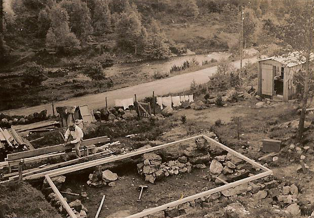 Pappa og onkel gjorde alt for hånd, gravde ut jord og løet stein til grunnmuren. Så satte de opp reisverk og la tak, kledde vegger og satte inn vinduer, alt av brukte materialer. Etter krigen måtte fikk en ikke bruke nye materialer til hytter, de var forbeholdt husbygging. De måtte også bygge kjøkkeninnredning og senger. Ingenting ble kjøpt ferdig.