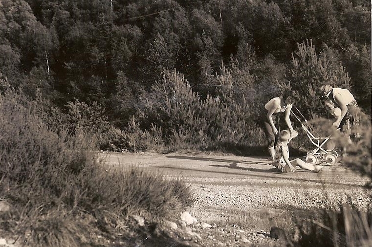 Brit, Finn, Lisa og Wenche leker på riksveien i 1959.