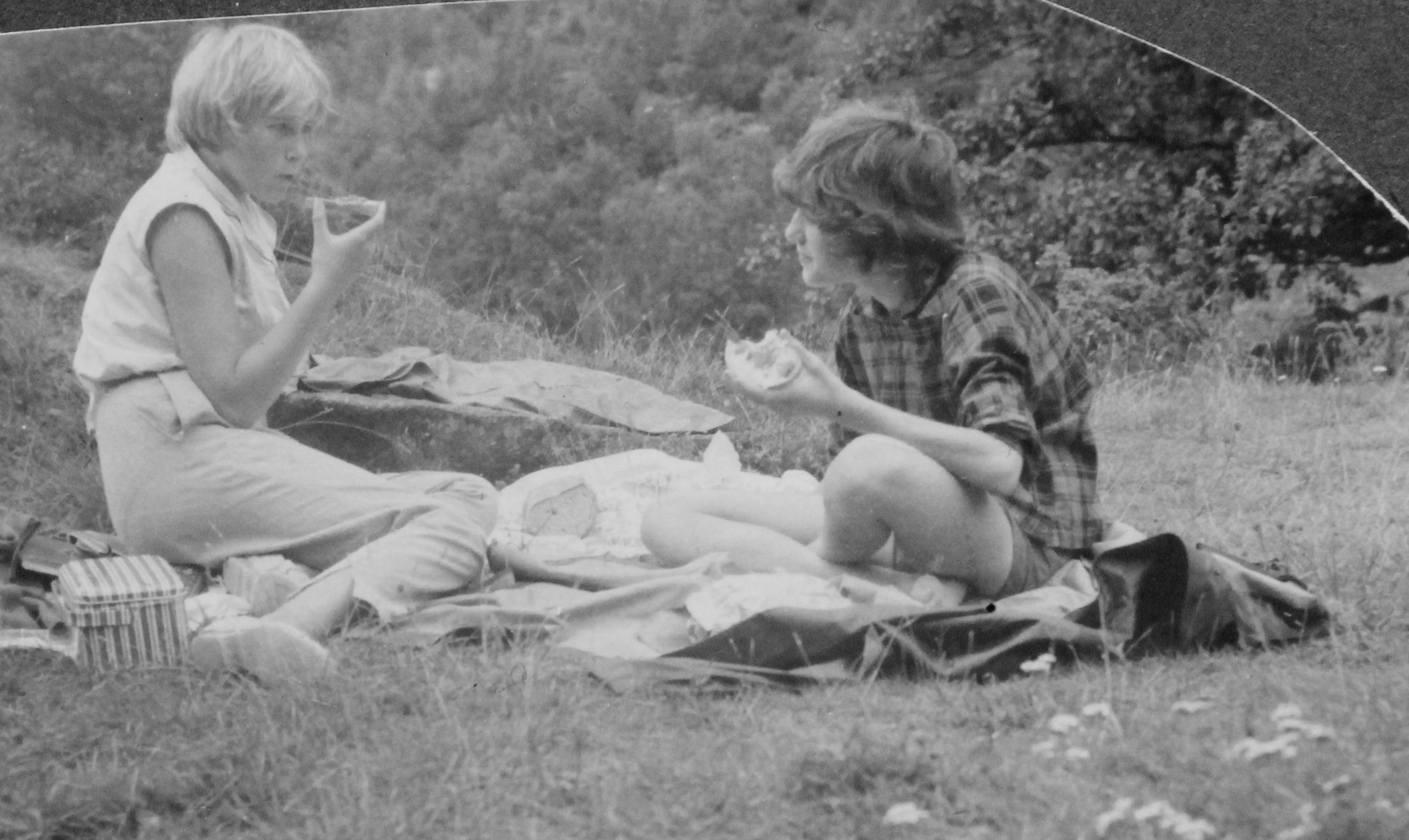 Jeg hadde ofte en skolevenninne, Brit, med i hytta. Det hører med til hennes beste barndomsminner, hun stortrivdes der. Da vi var i 13-14-års alderen fikk vi reise i hytta alene. Det var stor stas. Vi har nok vært «voksne» og fornuftige. Når jeg tenker tilbake på en spesiell uke tror jeg det. Jeg var vant med å passe min lillesøster Wenche hver dag etter skolen. En sommer var Brit og lillebroren Finn med oss på hytta. Søndag kveld reiste mine foreldre hjem. Så da var Brit og jeg alene med to småbarn, Wenche var nesten to år og Finn fem år. Vi tok oss av dem en hel uke. Vi lekte på veien, badet i dammen og koste oss med ungene. Jeg lurer på om jeg hadde latt to 14-åringer ta seg av mine barn en uke alene i hytta. – Jeg må jo få lov å innbille meg at vi må ha vært svært ansvarsbevisste!
