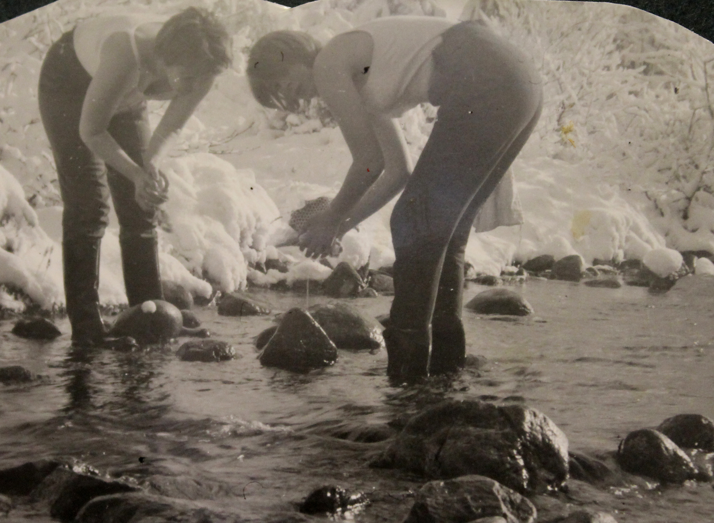 Her tok vi ofte morgentoalettet, for ingen hadde slik luksus som dusj. Påsketider når det ennå kunne være litt snø sto vi i støvler i de iskalde vannet og skvettet vann på oss til en liten kattevask.