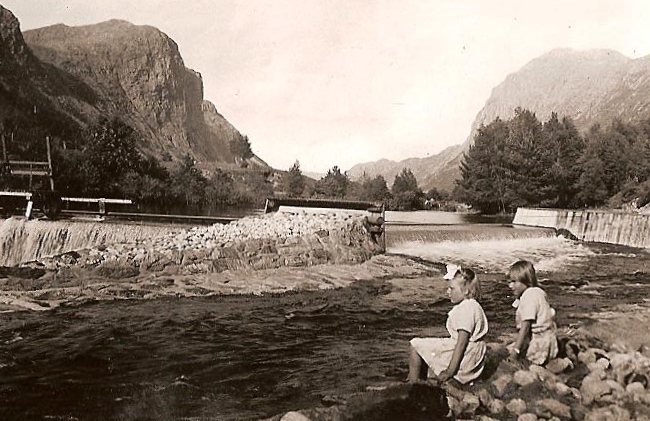 Vi klatret også på nedsiden av veien, der var det store steiner i vannkanten. Her stupte vi og så hvor langt ned vi klarte å dykke. Da var vi nok i 12-13-års alderen. Vanligvis balanserte vi på føringskantene langs veien. De var støpte i betong og cirka 15 cm breie øverst. Vi hadde god balanse og ikke høydeskrekk i de tider. Jeg tror vi gikk slik nesten helt inn til Tysdal.
