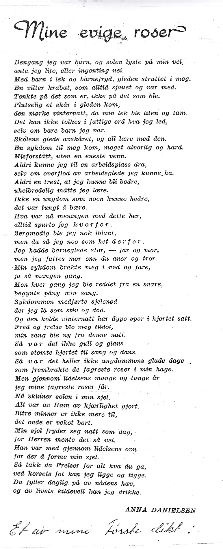 Anna ønsket folk skulle få anledning til å lese denne fortellingen. Den er tatt vare på av hennes slekt og den blir gjengitt med deres tillatelse.Bildene er fra familiens album som så vidt ble reddet fra en brann.