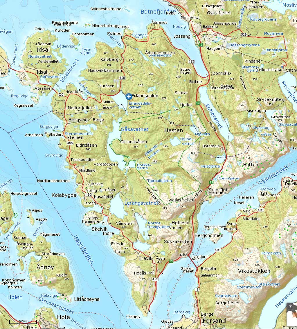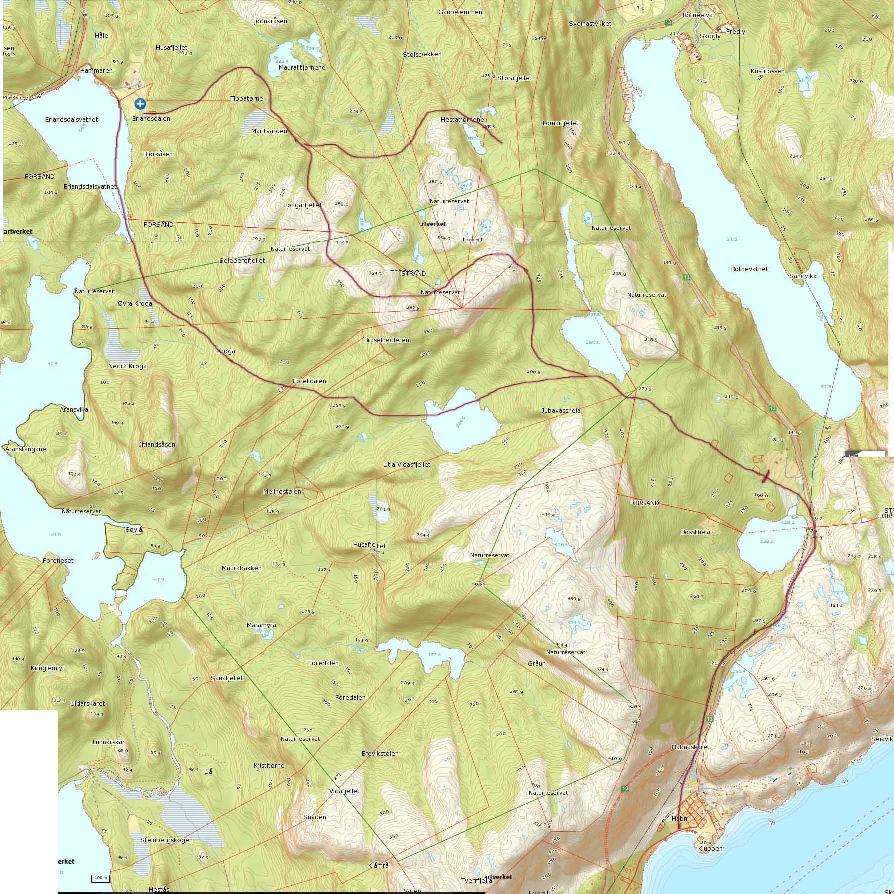 Her har jeg prøvd å tegne inn ruta de gikk fram og tilbake til Habn. Den andre ruta er da de gikk om Hesten for å levere lykta til Jens i Heia. Den tredje streken viser delvis området de hentet bær i. ATK.