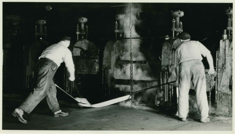 Varmevalsing av strips var en fargerik operasjon som krevde godt lagarbeid.