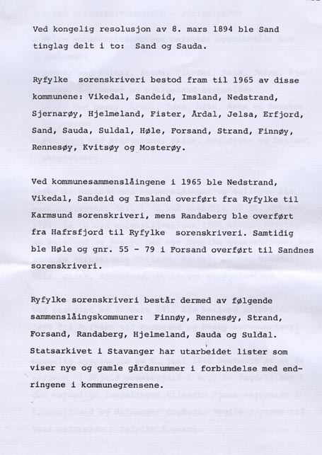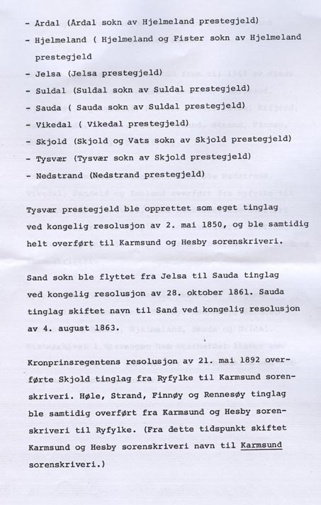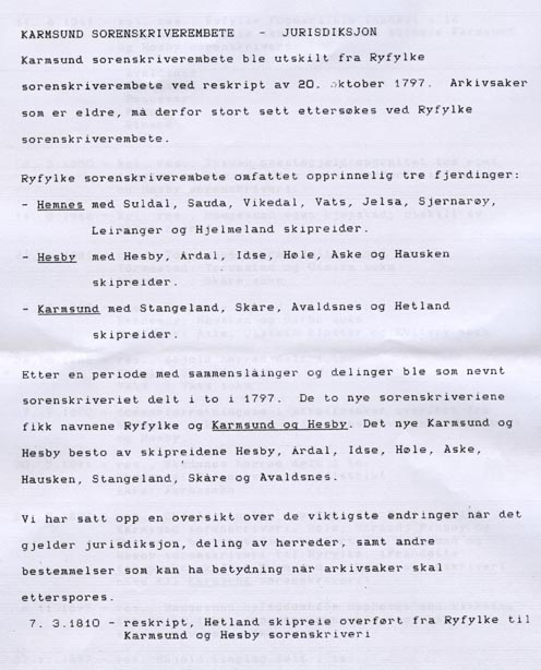 Heldigvis så har Jan Alsvik og andre på Statsarkivet laget en oversikt når og hvor kommunene er å finne. For Strand har hørt til Hesby, Karmsund og nå til Ryfylke. De finner dere nederst her.