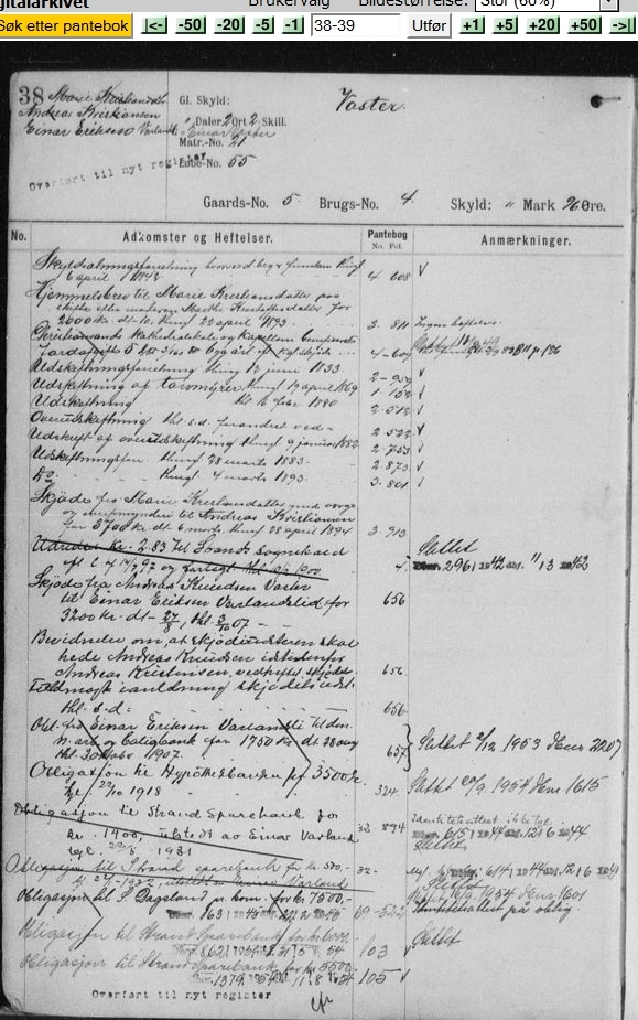 Jeg (amatøren Annalisa) trodde jeg kunne litt og skulle vise noe om det på et møte i historielaget. Det var greit å se i panteregisteret, men problemene kom da jeg skulle videre til panteboken. Jeg valgte Strand kommune sitt register og startet helt tilfeldig på side 38. Der var mange innførsler, om skjøter, jordavgift, utskiftninger, obligasjoner, overenskomster og enda mer fra årene 1842 og fram til 1954. Bare registeret gir en et innblikk i eiendomshistorien, når og hvem som eide den til enhver tid.