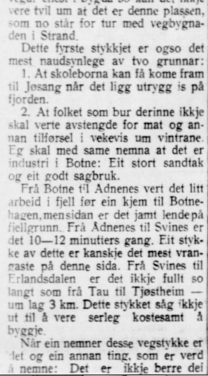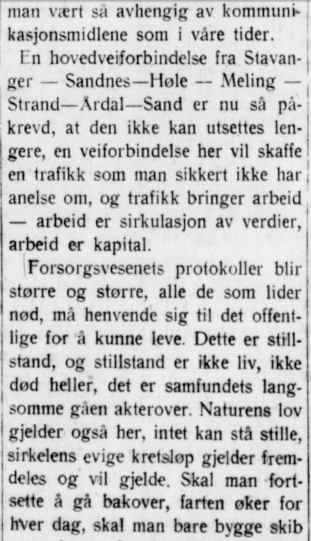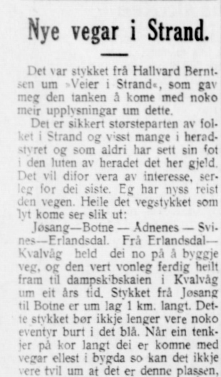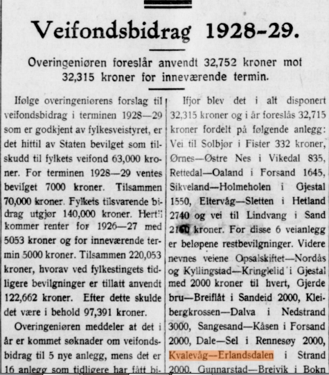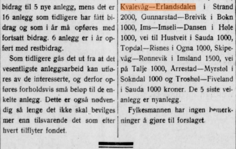 Staten bevilget penger til et veifond som fylket kunne bruke til å bygge veier med. I 1928/29 var det bare veien mellom Kvalvåg og Erlandsdalen som fikk tilskudd i Strand. Det var ikke nok så det ble bevilget mer neste år også.